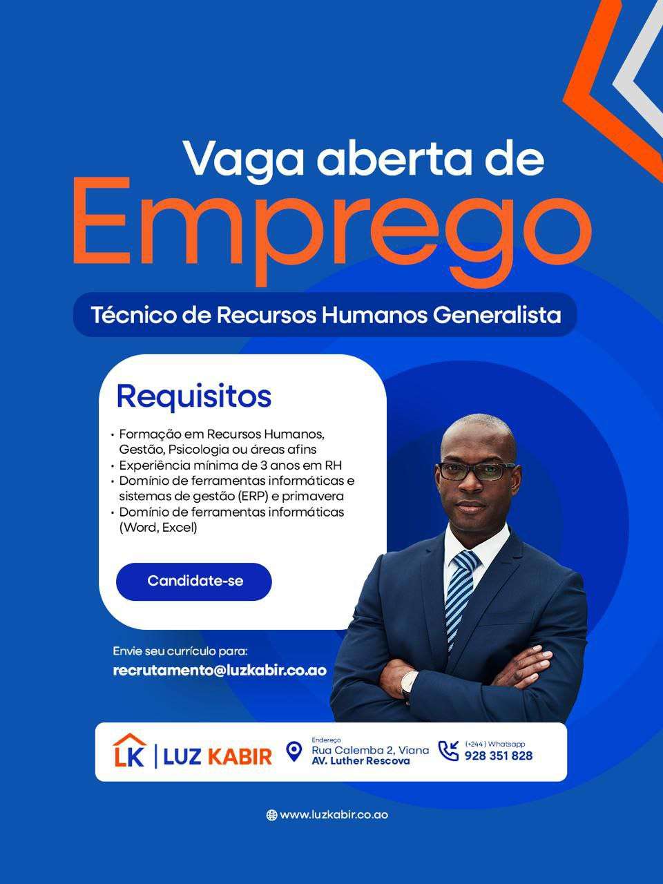 LUZKABIR está em processo de expansão da sua equipa de Recursos Humanos e procura um profissional dinâmico e experiente para ocupar a posição de Técnico de Recursos Humanos Generalista. Esta é uma excelente oportunidade para quem pretende integrar uma empresa sólida e desenvolver uma carreira na área de Gestão de Pessoas.